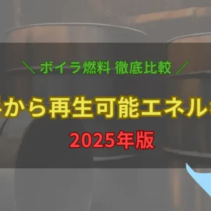 2025年のボイラー燃料を比較するイメージ画像。固体燃料・液体燃料・気体燃料・再生可能エネルギーの特徴と違いを解説する記事のアイキャッチ