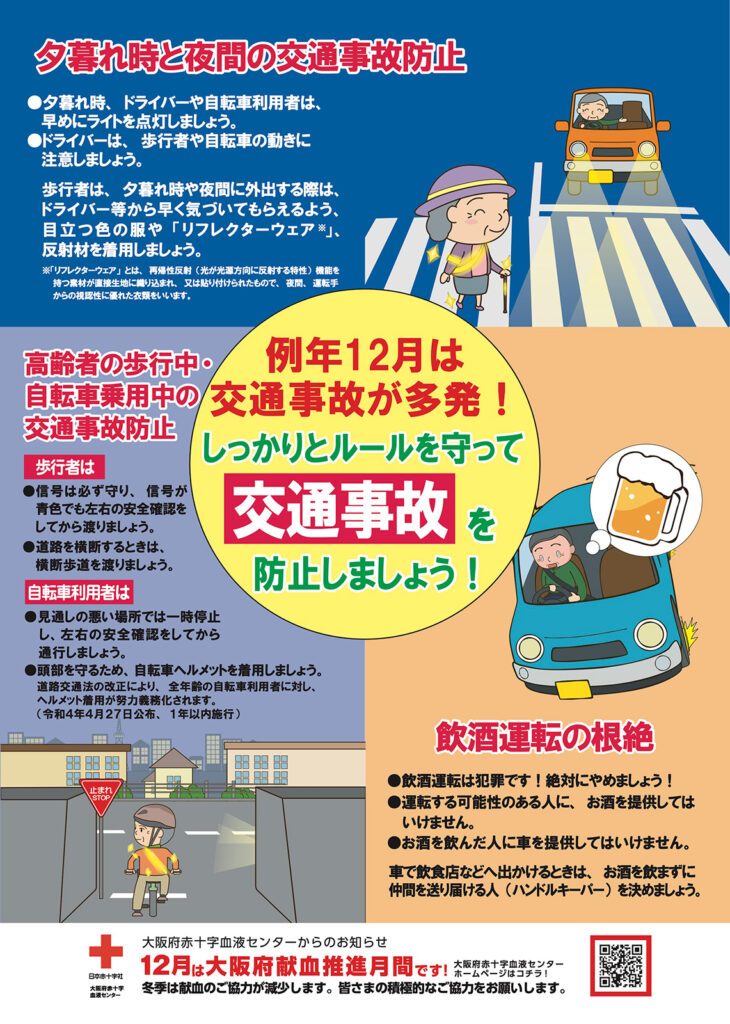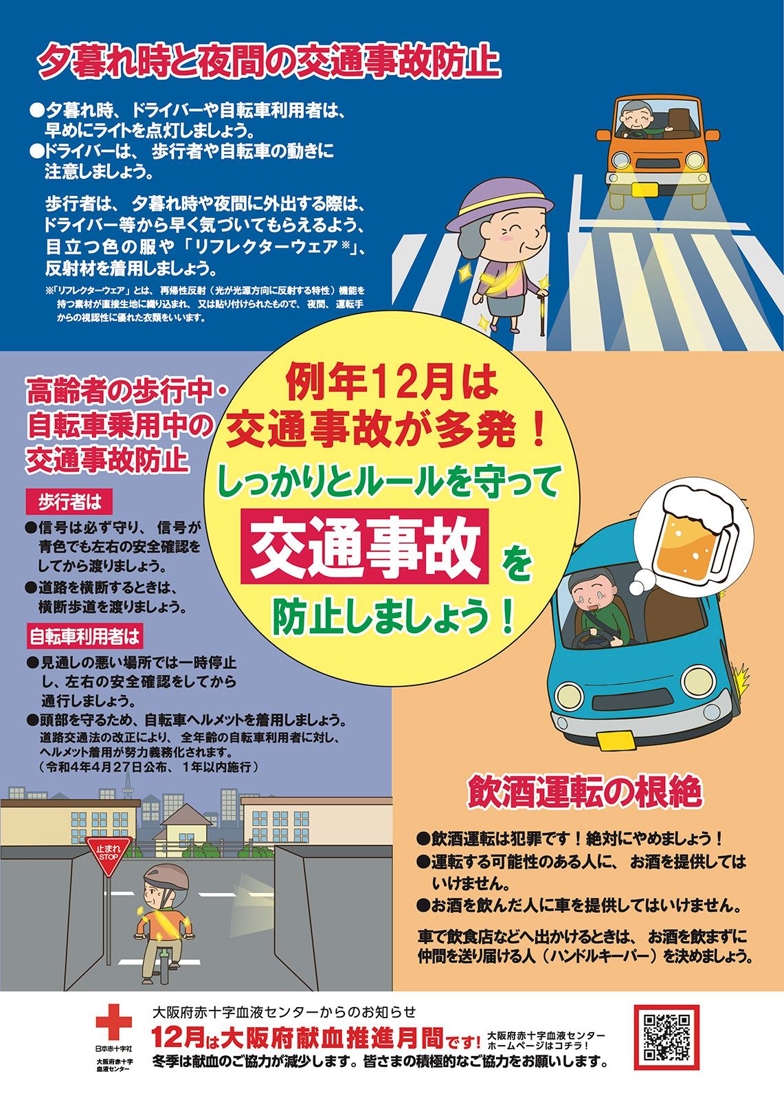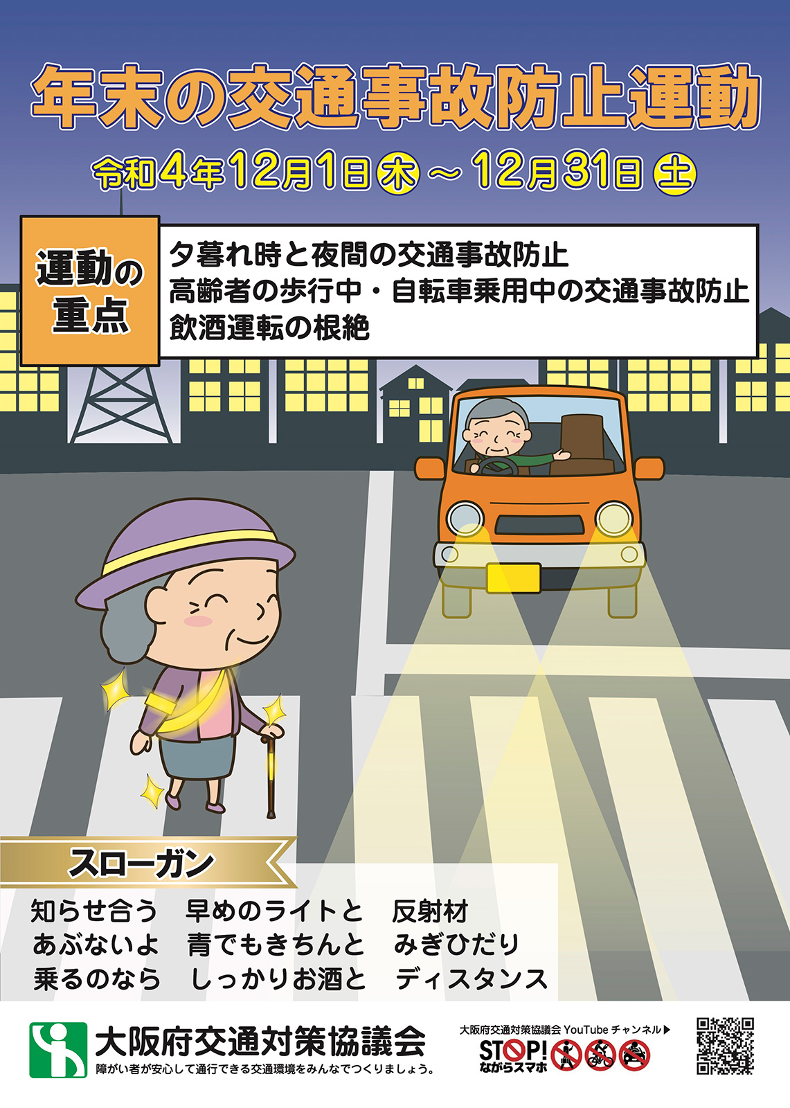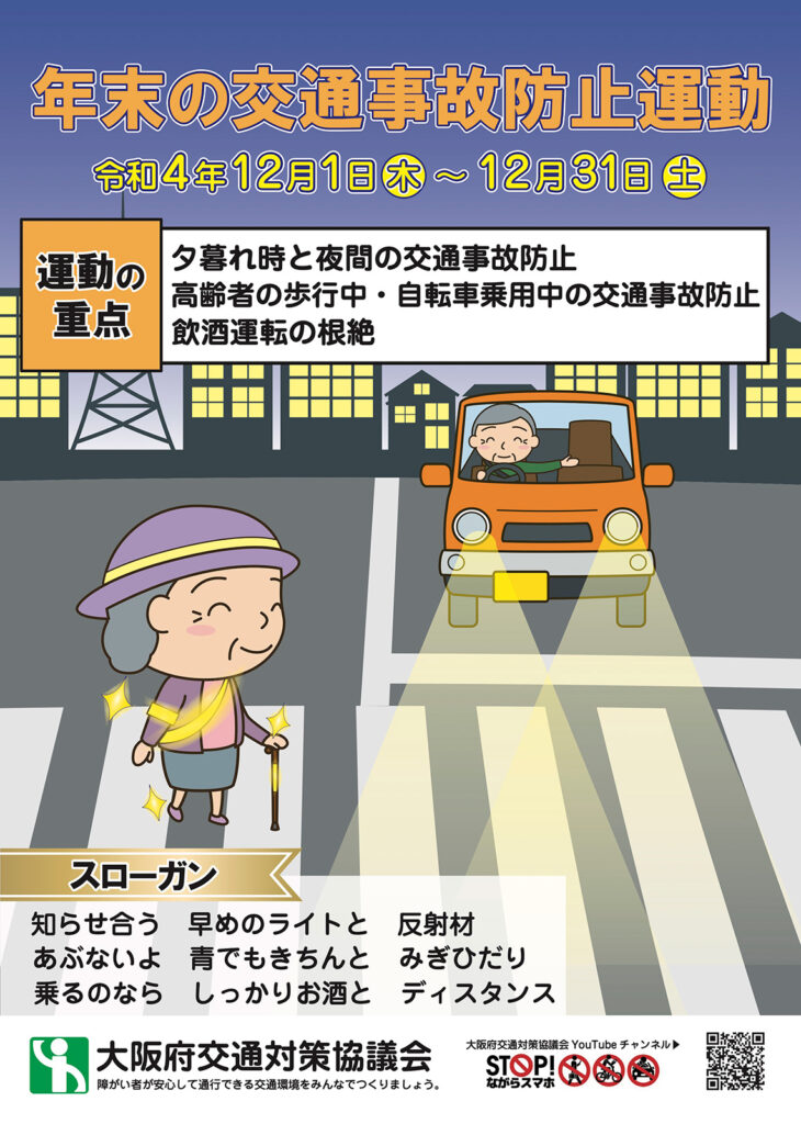 日没時間も早まり、夕暮れ時から夜間帯にかけての特に日没後1時間以内の交通事故が急増する傾向にあることから、ひとり一人が交通ルールの遵守と正しい交通マナーの実践を習慣付け、交通事故防止に努めていかなければなりません。